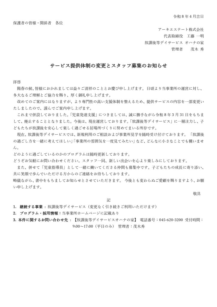 児童発達支援「オハナの家」廃止についてのお知らせ